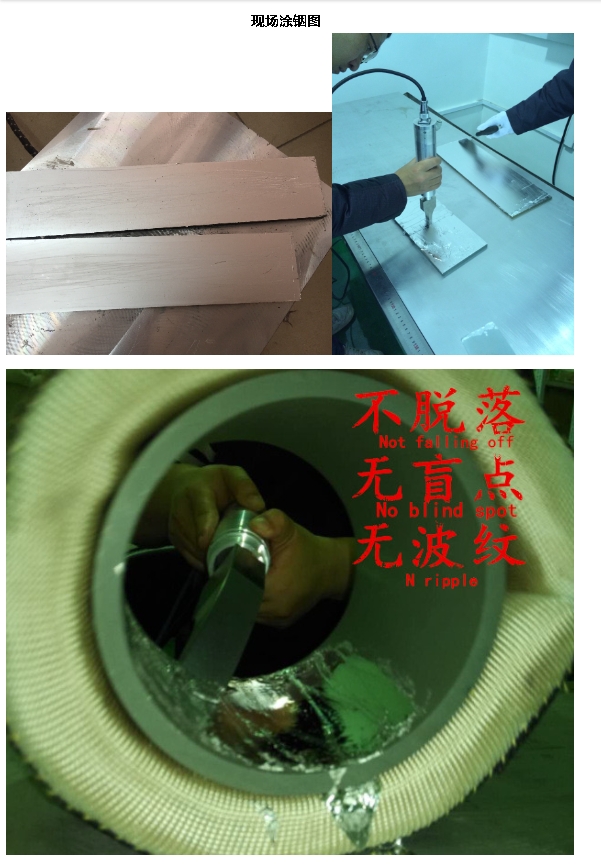 4、焊头在铜板或ITO靶上移动一遍,用铲将表面多余的铟刮去,看是否有盲点,一般铜板需焊2~3遍,ITO靶需焊4~5遍,焊头移动速度约1~2厘米/秒。