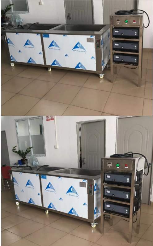 2.外壳采用3041.0mm不锈钢板。共用3台电流表能型超声波发生器。设备含放置超声波发生器的电柜一个。超声波电柜有带超声波计时,超声波启动。温度显示等功能, 电柜的使用电压为380V。超声波电柜内3台发生器直接控制水槽内的超声波清洗。